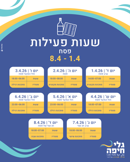 במהלך חג הפסח מרכז הספורט גלי חיפה יפעל בשעות פעילות מיוחדות בין התאריכים 1.4-8.4.